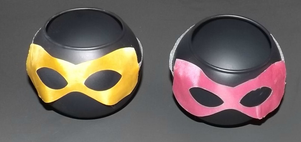 To go around the buildings, I created several thing. First up, is the candle holders below. I spray painted them black. The masks are fabric and were made using a simple